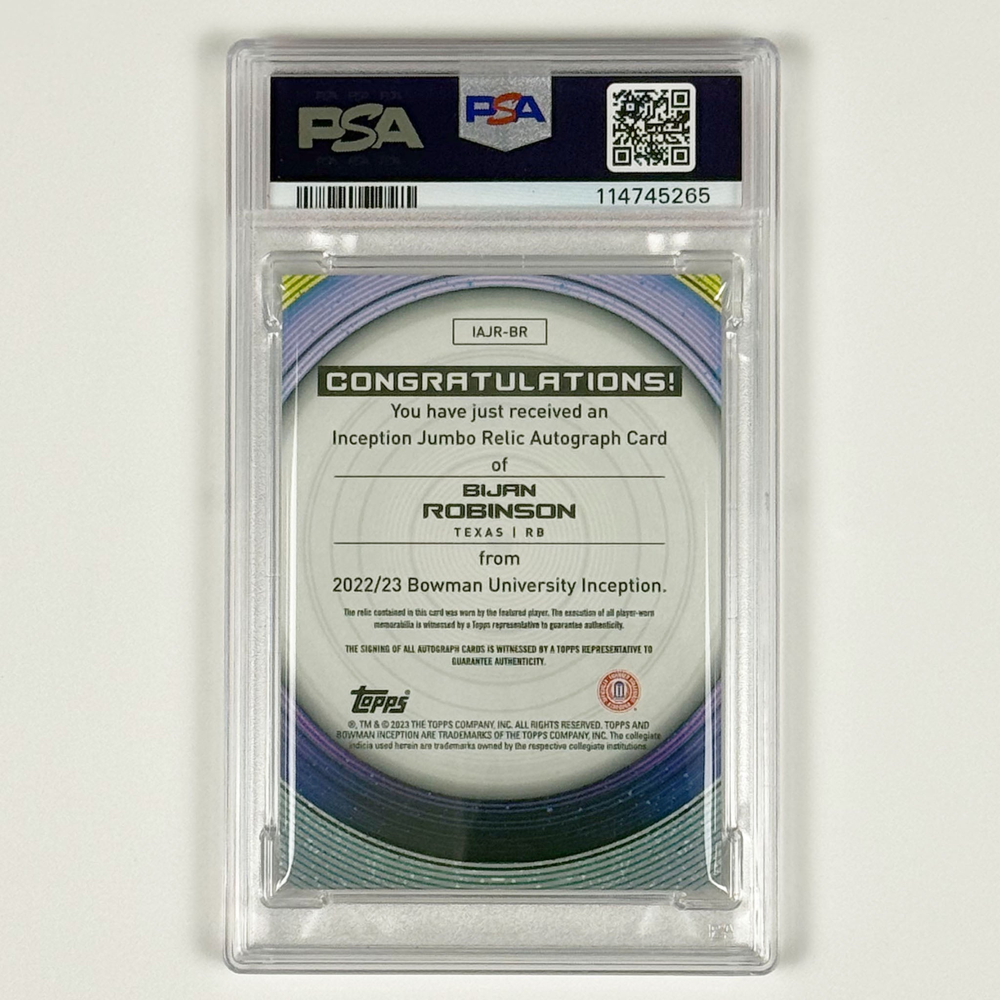 Bijan Robinson – A generational running back prospect and top NFL draft pick, widely regarded as one of the most complete RB talents of the modern era with elite long-term upside. A centerpiece Bijan Robinson collectible combining jumbo player-worn memorabilia, on-card autograph, premium Bowman U Inception design, and PSA 10 top-grade status.